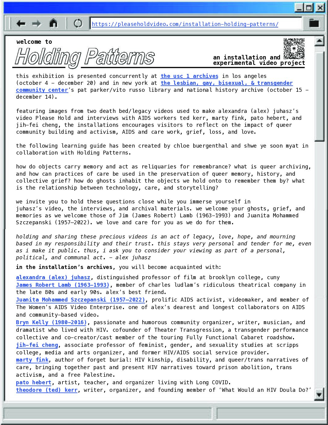 Chloe Buergenthal and Shwe Ye Shoon Myat are co-creators of the teaching guide “for further learning” that accompanies the installation in NY at the Center’s Pat Parker/Vito Russo Library and in LA at ONE Archives at USC Libraries (October -December, 2025). Please activate the guide with its QR code (below) to engage on your phone. You can use this website as a kind of installation! The full guide is also available here.