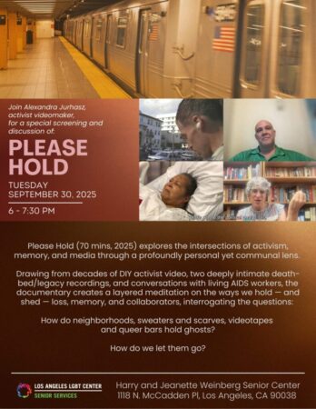 Los Angeles LGBT Center, September 30, 6pm. Harry & Jeanette Weinberg Senior Center, Special Seniors Screening! (all ages welcome).